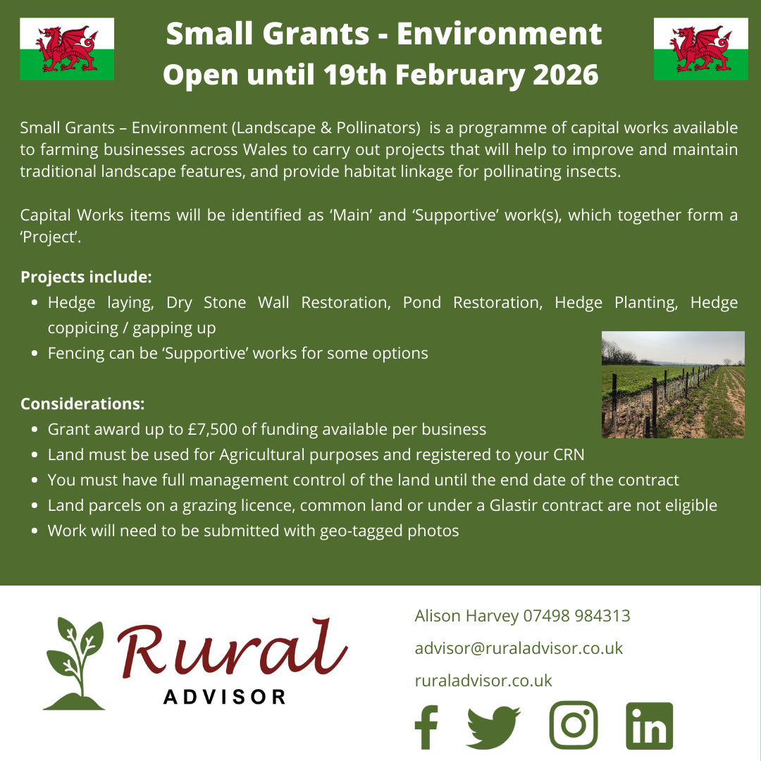 Small Grants Environment – Open in Wales until 19th February 2026 Published On - 28 January 2026 Maria Watts Blog #smallgrantswales #ruralbusinessadvice #environment